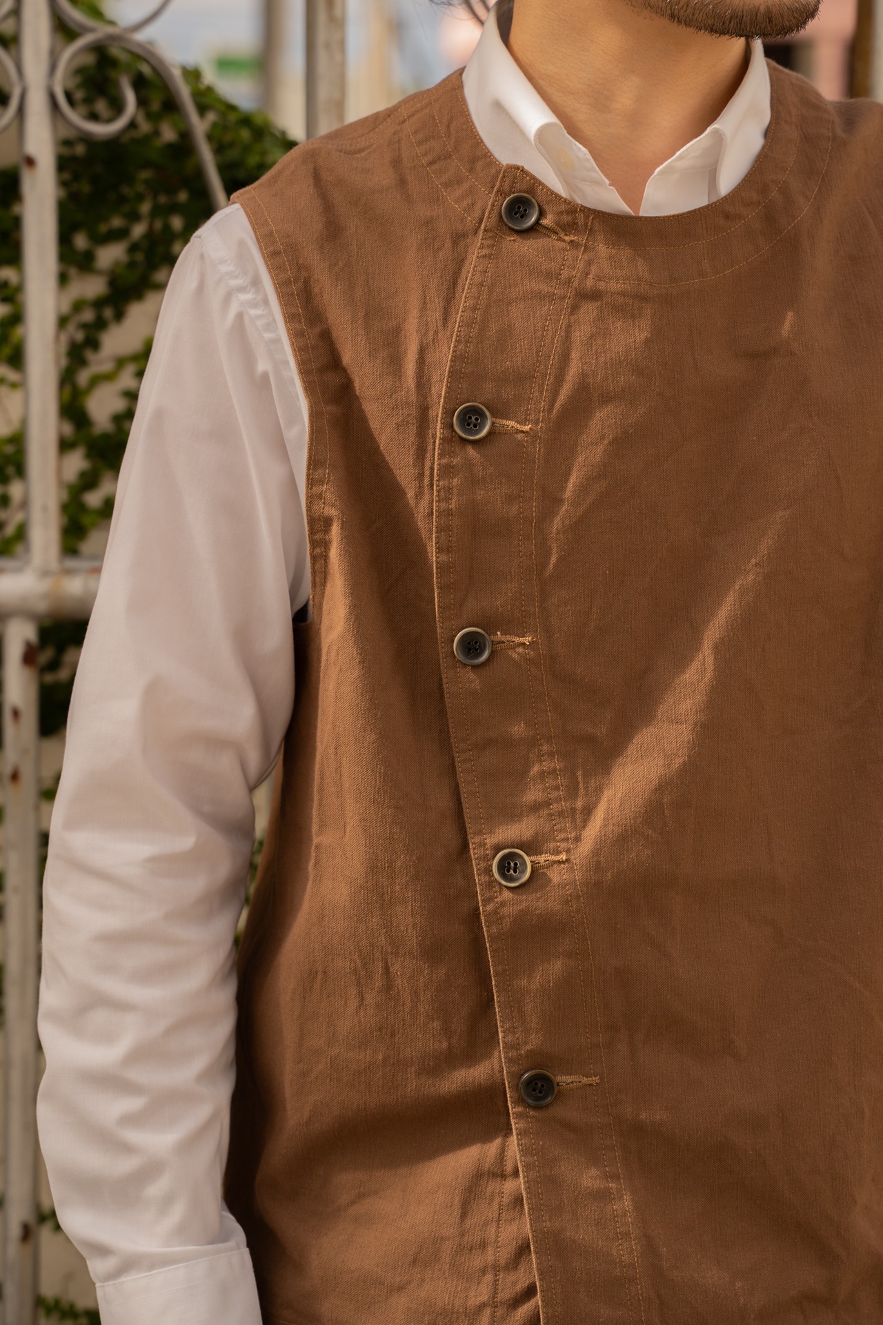 脇ハギの無い⼤きく⼀枚の⽣地で裁断された40年代FRENCHのワークベストから着想しシンチバック付のVESTにモディファイ。