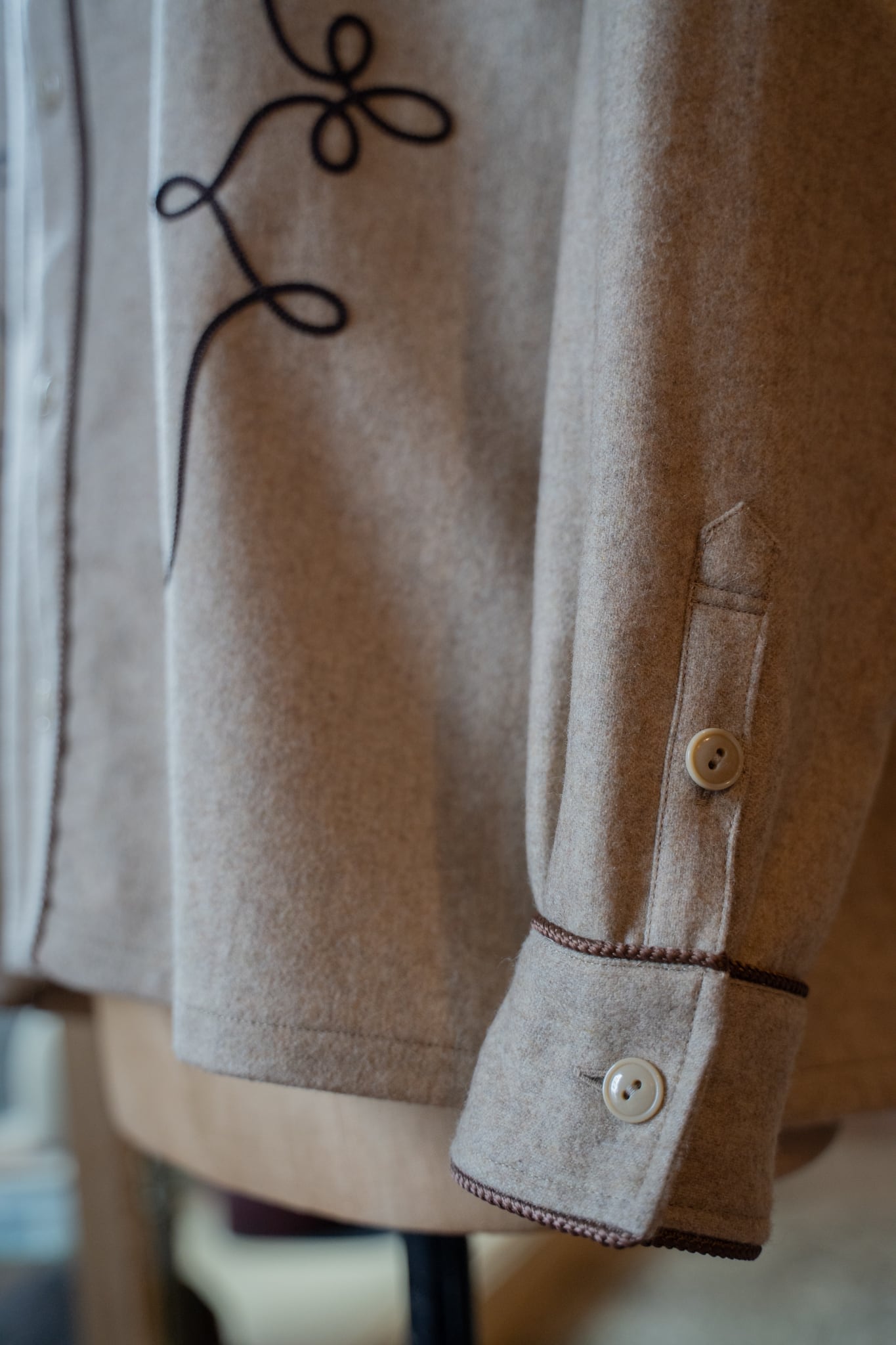 起毛感のあるウールにコード刺繍がアイコニックな1着。