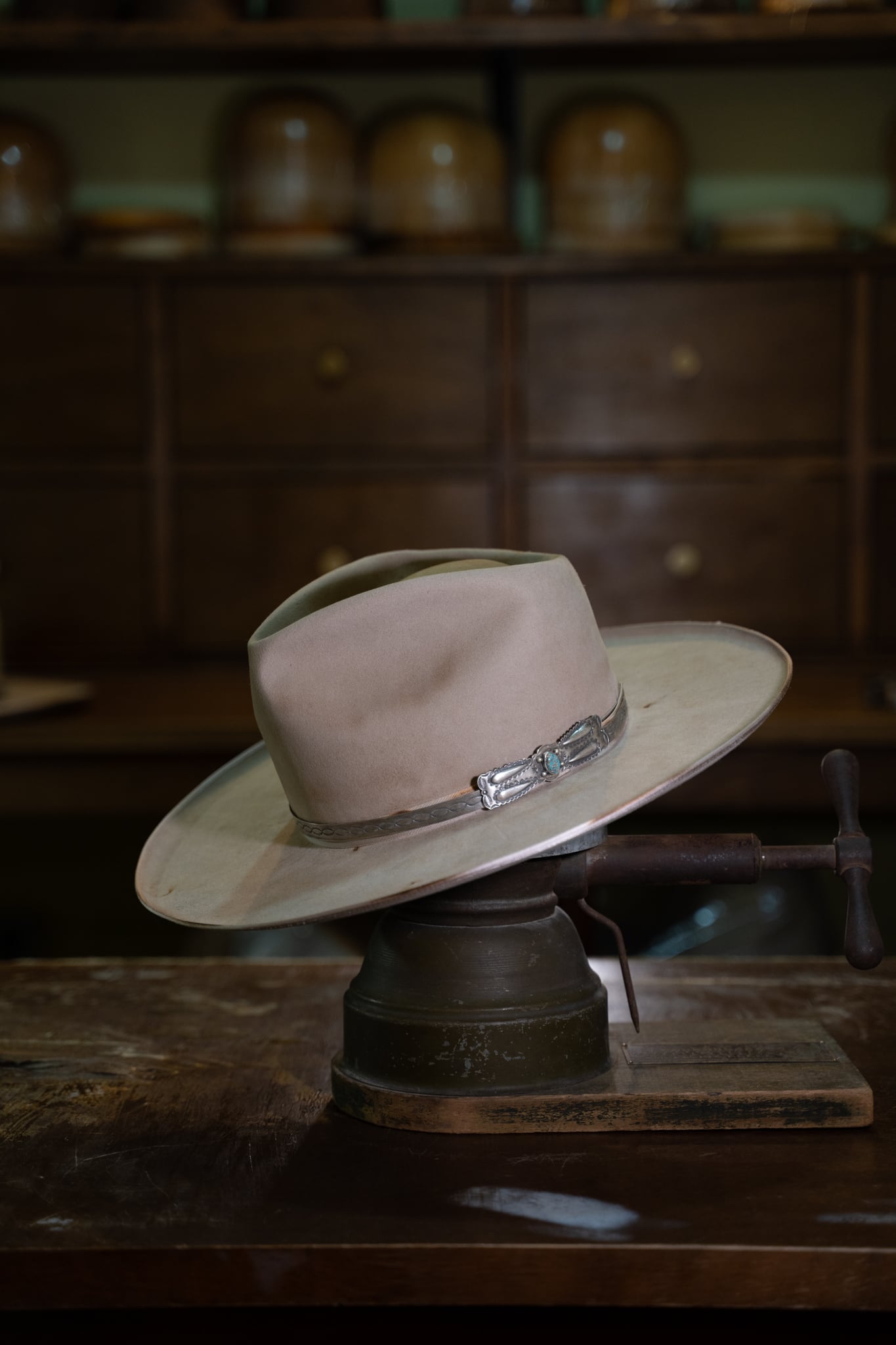 本作の大きな特徴は、往年のバイカーやウエスタンシーンで愛された“ビンテージハットバンド”を現代に再現した、ms_ring.jewelry 特注のシルバーハットバンド。
