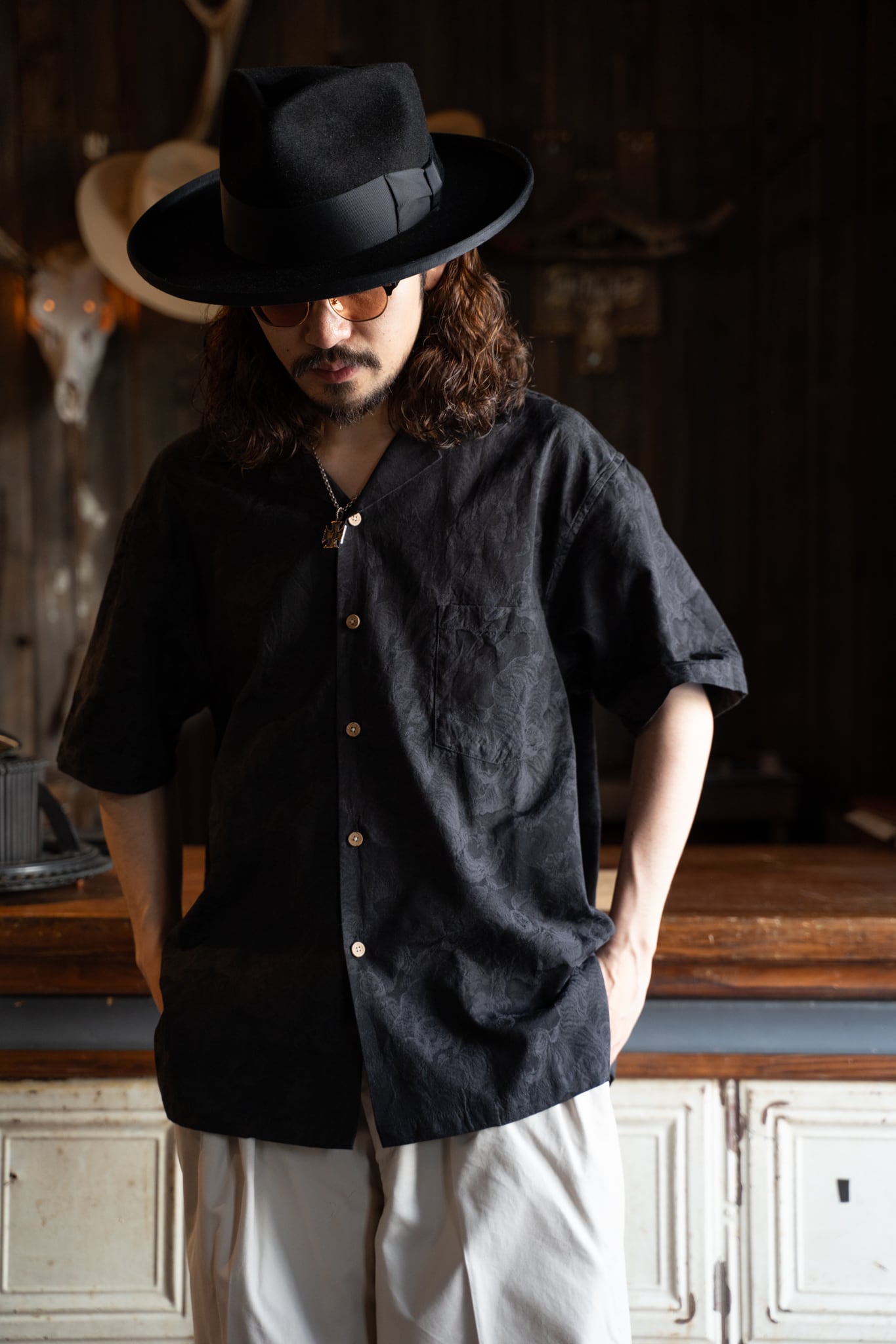 柄は敢えて前面に出さず、ワントーンで仕上げることで、大人なスタイルのアロハシャツに仕上がっています。